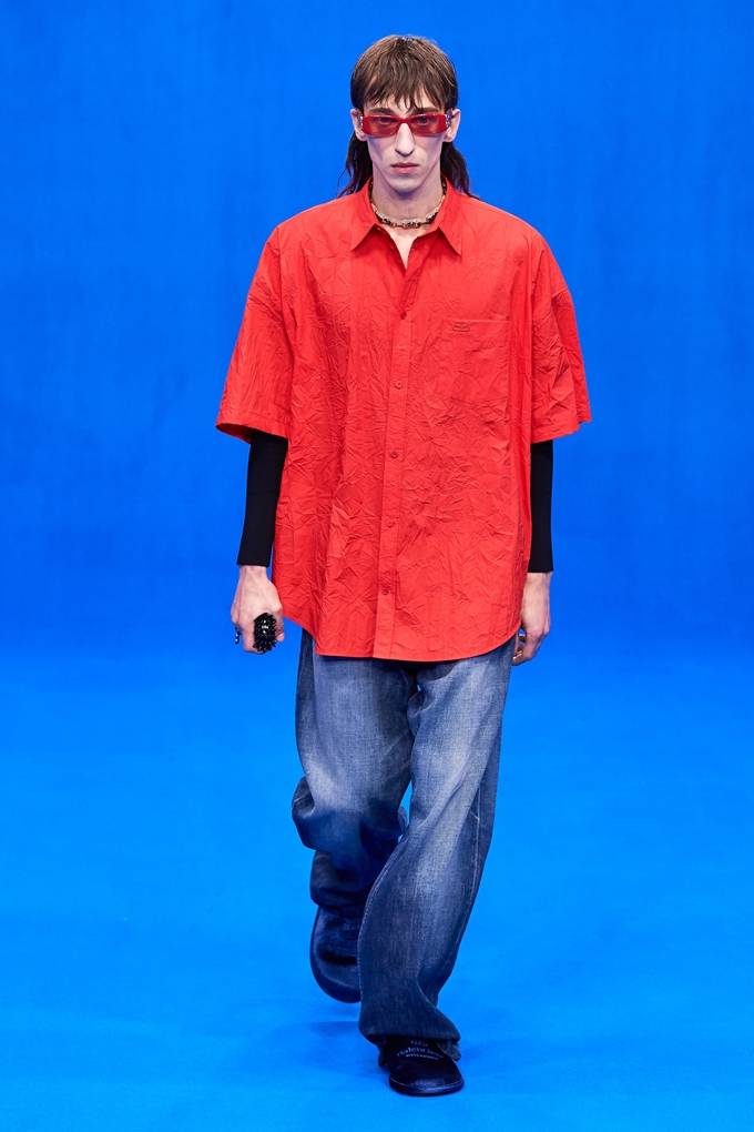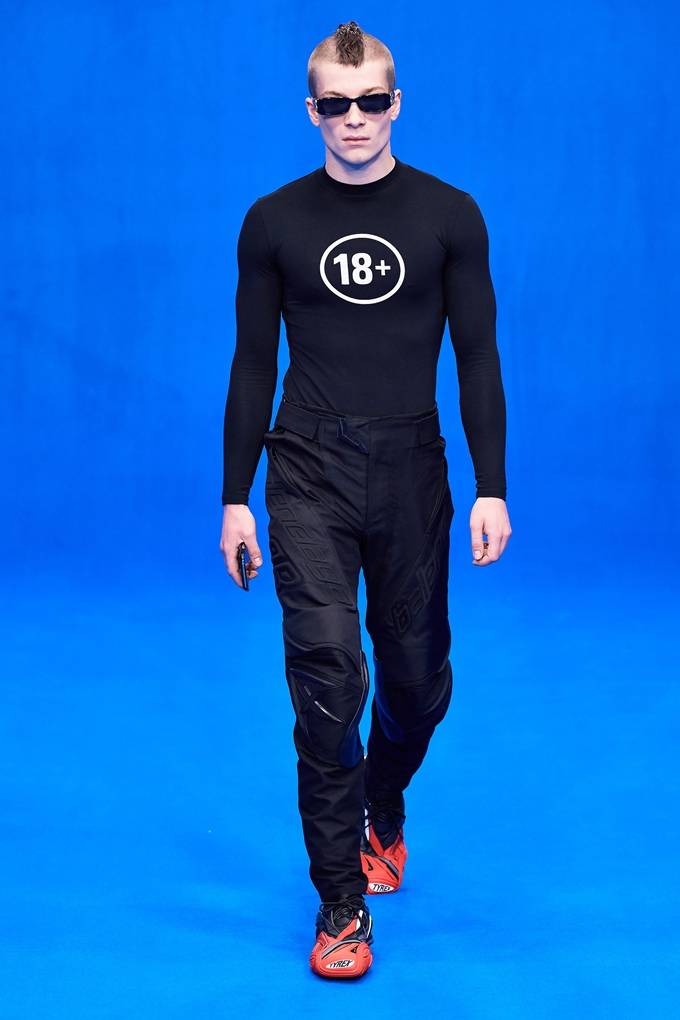 로고마니아적인 요소와 함께 브랜드 약자 BLNCG 혹은 Balenciaga 그래픽 프린트가 플리세 실크 드레스에 사용되었으며 향수병 프린트 드레스도 선보였다. 외부에 있는 모든 좌석 안내원들은 로고 레인 슬리커를 입고 있었다.
