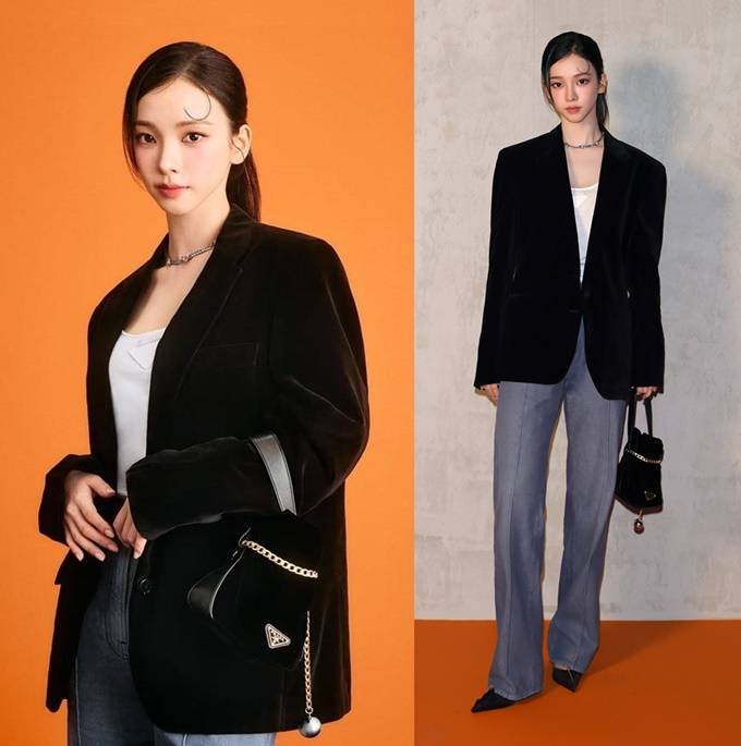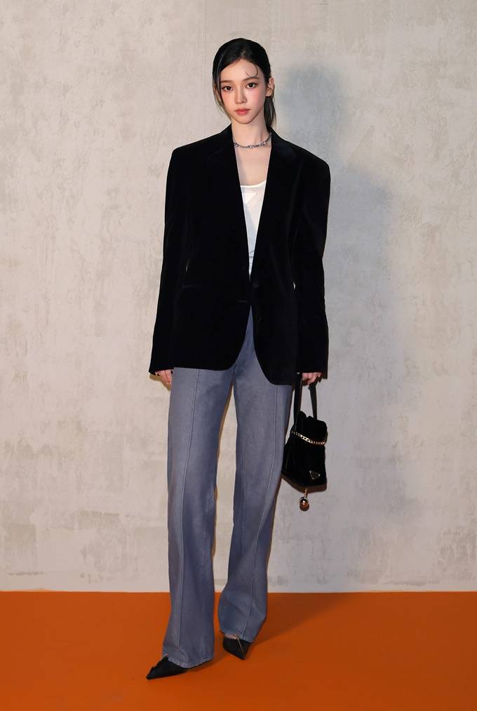 그룹 엔하이픈과 한국 대표로 프라다 쇼에 참석한 카리나는 블랙 벨벳 재킷과 데님 팬츠를 매치한 시크한 패션위크 스타일로 눈부신 비주얼을 자랑했다.