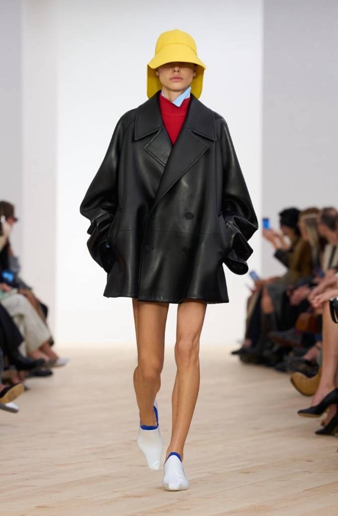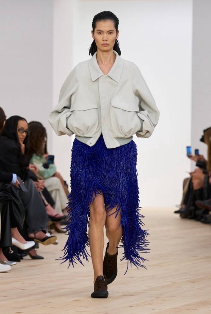 하우스의 시그니처 소재인 가죽을 활용한 컬러 블록 미니 드레스와 아워글래스(모래시계 실루엣)을 강조하는 모크넥 재킷 등 로에베의 장인 정신을 기념하는 의상들이 선보여졌다.