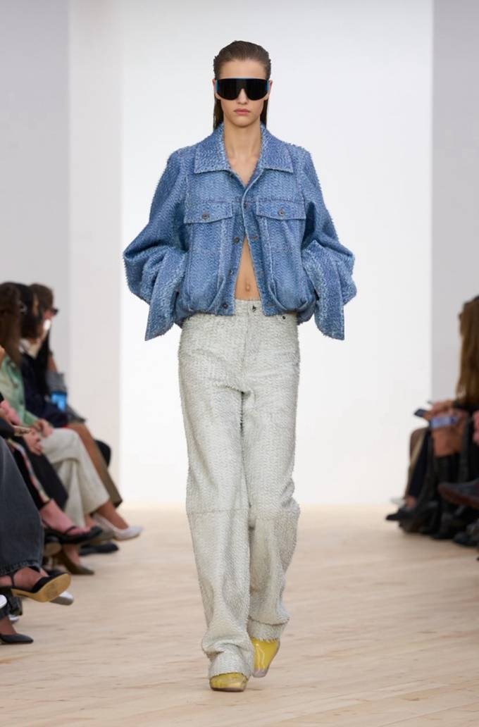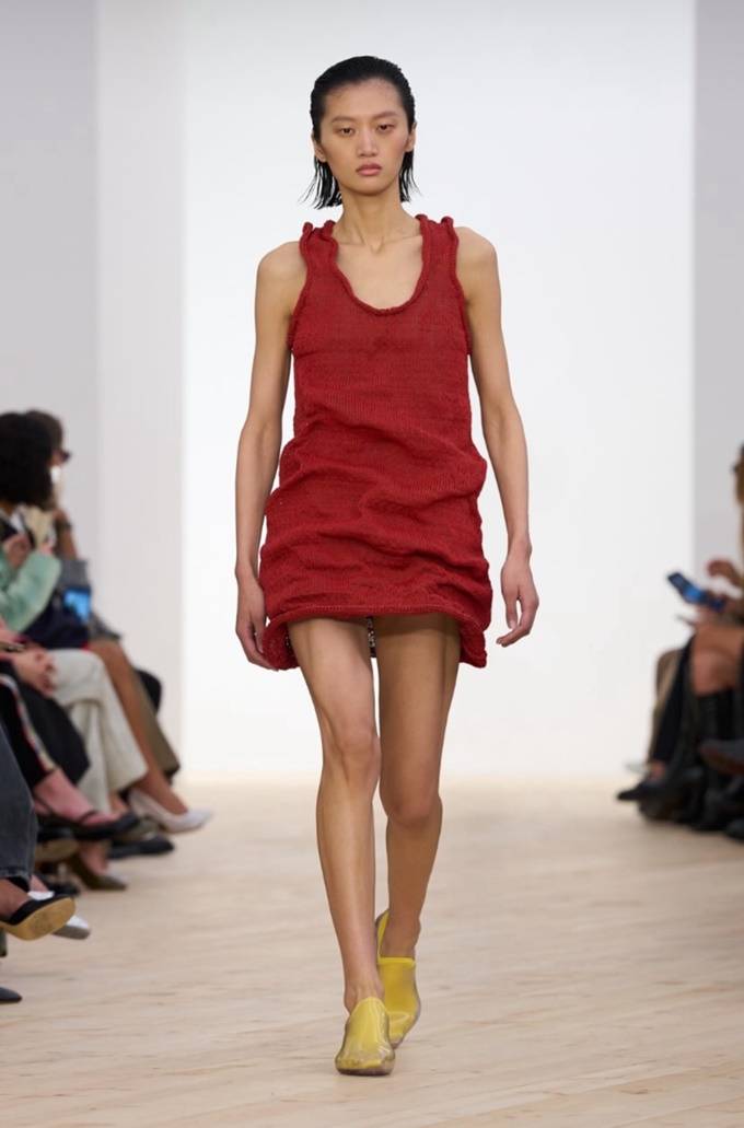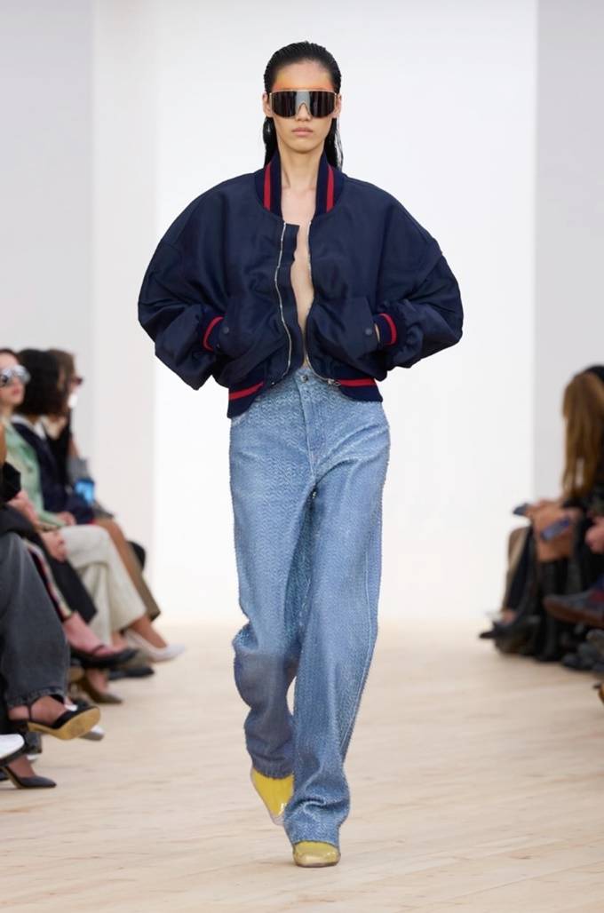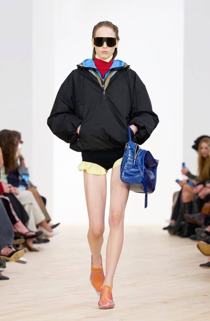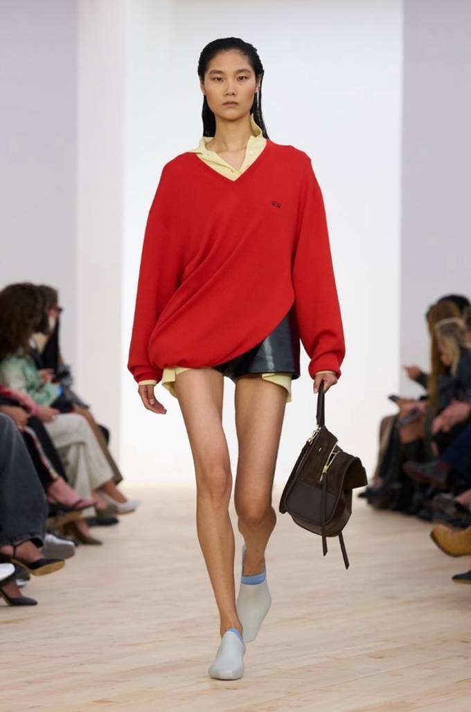 풍성한 윈드브레이커에 프릴 장식의 마이크로 쇼츠를 매치하고, 노란색과 주황색 털실 소재의 스트레이트 에지 트렌치코트, 몸에 딱 달라붙는 스트라이프 드레스 등 로에베의 유산을 재해석,는 관능미와 열정으로 활기를 불어넣었다.