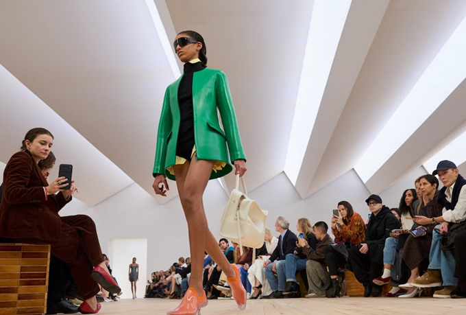 하우스의 시그니처 소재인 가죽을 활용한 컬러 블록 미니 드레스와 아워글래스(모래시계 실루엣)을 강조하는 모크넥 재킷 등 로에베의 장인 정신을 기념하는 의상들이 선보여졌다.