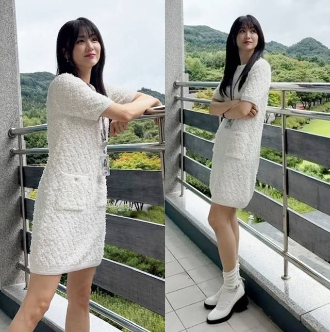 공개한 사진과 영상에서 박하선은 깔끔한 화이트 트위드 원피스에 화이트 삭스와 첼시부츠를 매치한 출근룩으로 청순하면서도 단아한 미모를 드러냈다.