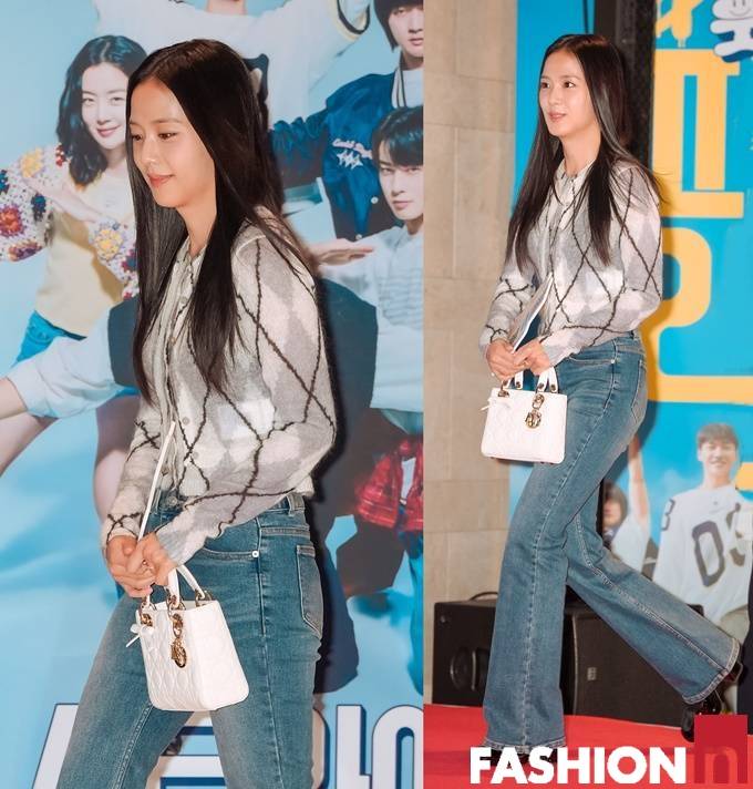 그룹 블랙핑크(BLACKPINK) 지수가 교과서 같은 니트와 데님 조합의 시사회룩으로 잠실을 들썩이게 만들었다.