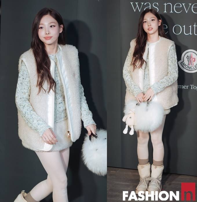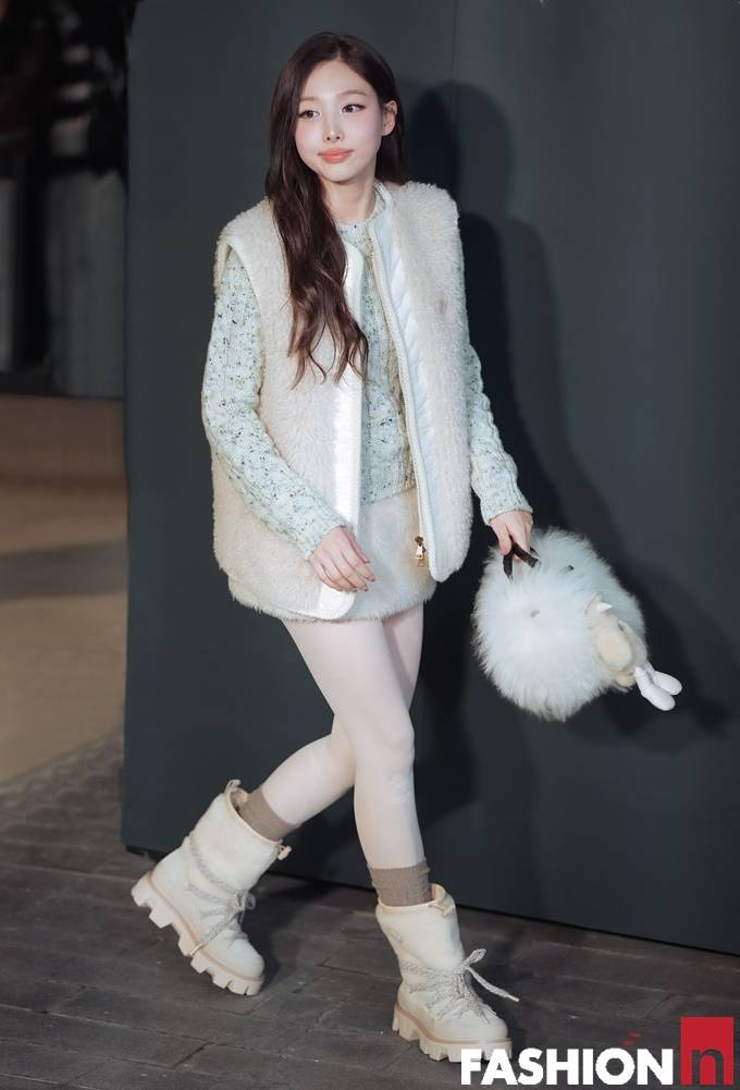 그룹 트와이스 나연이 러블리한 퍼 베스트 투피스룩으로 사랑스러운 미모를 빛냈다.