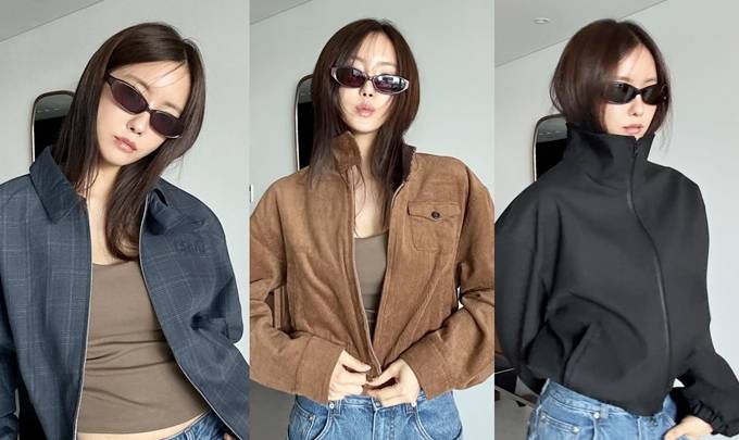 공개한 사진에서 효민은 브라운, 블랙, 체크 등 3가지 컬러의 블루종 재킷 스타일링으로 가을 간절기 패션의 정석을 선보였다.