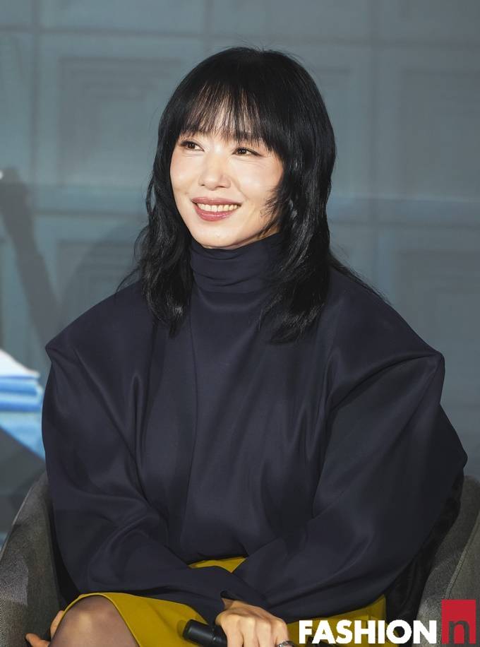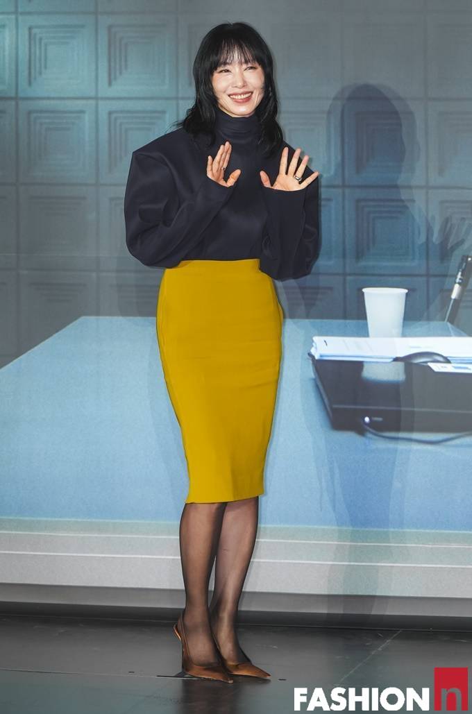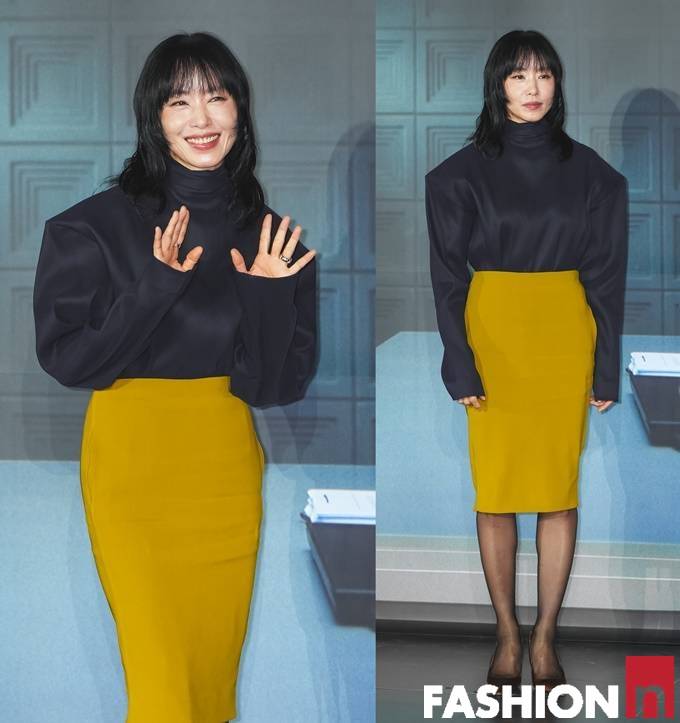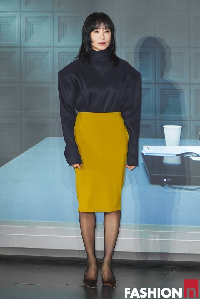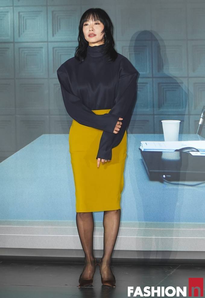 배우 전도연이 파워숄더의 하이넥 블랙 블라우스와 H라인의 카멜 스커트를 매치한 우아한 오피스룩으로 변함없는 미모를 빛냈다.