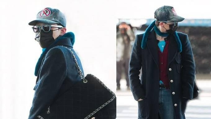 이날 지드래곤은 클래식한 맥시 코트와 모피 쁘띠 머플러, 마스크와 볼캡, 여기에 퀼팅 핸드백을 매치한으로 꽁꽁 감싼 공항패션으로 눈길을 사로잡았다.