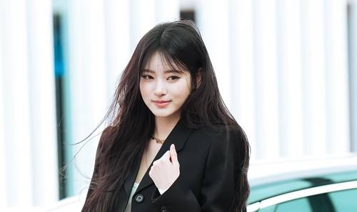 그룹 미야오(MEOVV)의 멤버 안나가 하늘하늘 A라인 비율의 투피스 슈트룩으로 시크한 미모를 드러냈다.