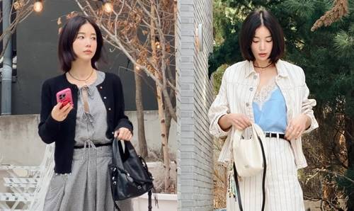 공개한 사진에서 기은세는 체크 원피스에 블랙 카디건을 매치한 단아하면서 여성스러운 스타일과 와이드 핏 스트라이프 팬츠와 셔켓 셋업의 슈트에 블루 이너로 포인트를 준 외출룩으로 세련되면서도 스타일리시한 무드를 드러냈다.