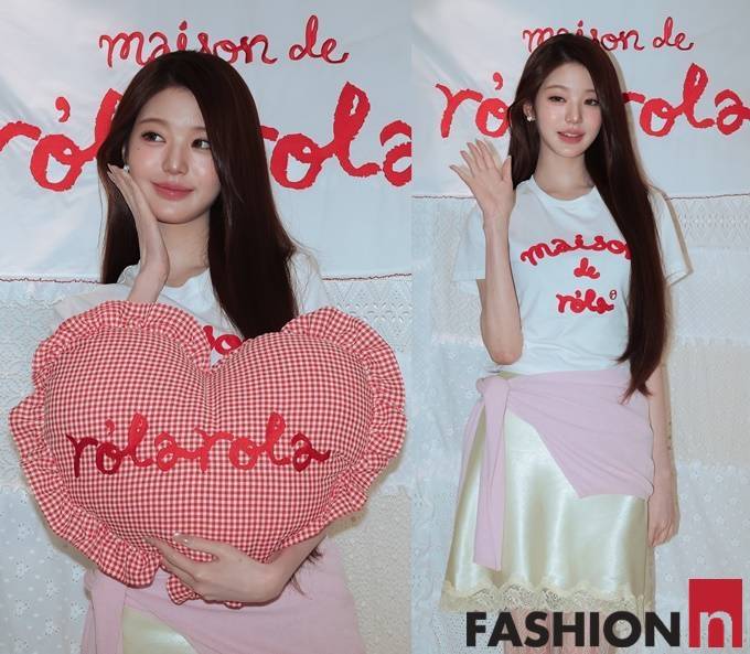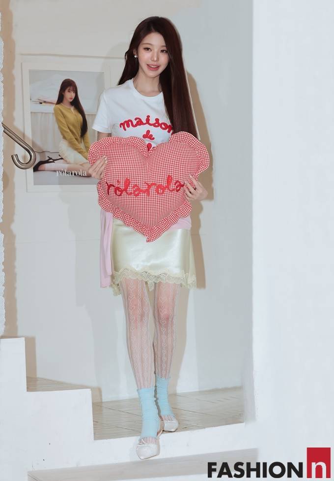 이날 장원영은 긴 브라운 생머리에 레드 자수 포인트인 화이트 티셔츠, 레이스 스커트, 여기에 연핑크 카디건을 허리에 두른 러블리 패션으로 눈길을 사로잡았다.