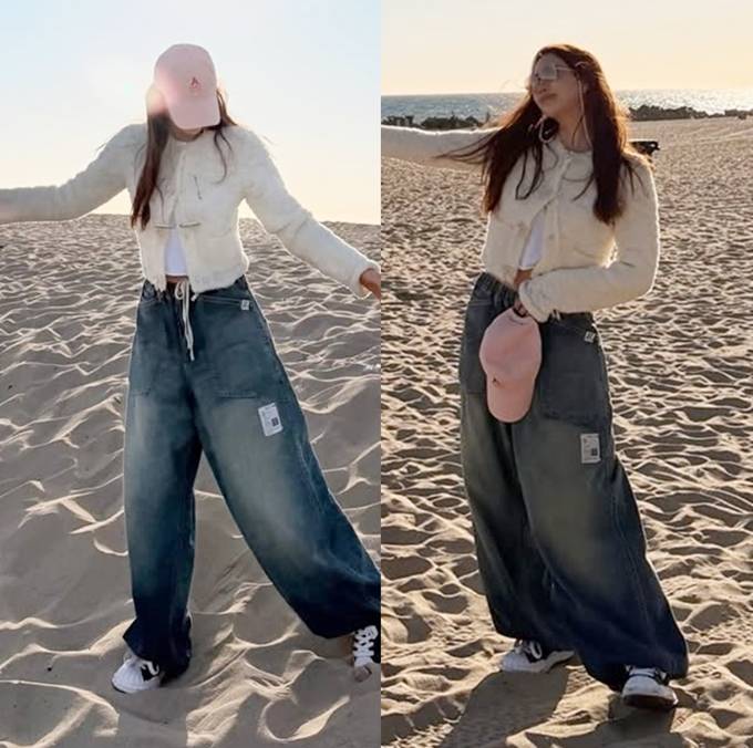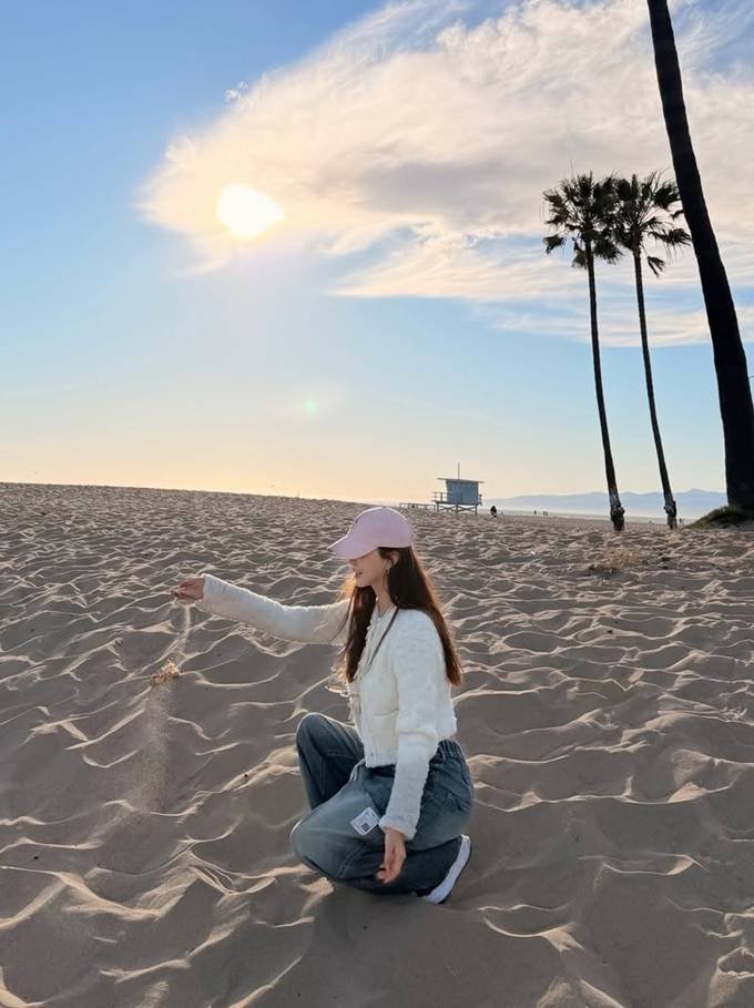 이다해, LA 베니스 비치의 노을! 와이드 데님에 크롭 재킷 여유로운 레이어드 산책룩
