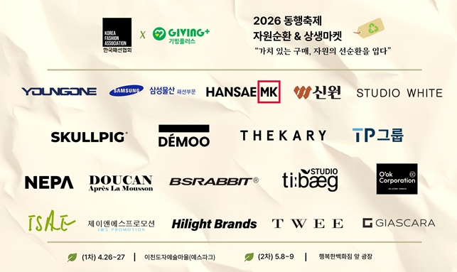 한국패션협회(회장 성래은)는 오는 4월 26일부터 ESG 플랫폼 기빙플러스(대표 정형석)와 공동으로 ‘자원순환 & 상생 마켓’을 개최하며 2026 동행축제(중소벤처기업부 주최, 한국중소벤처기업유통원 주관)에 참여한다고 밝혔다.